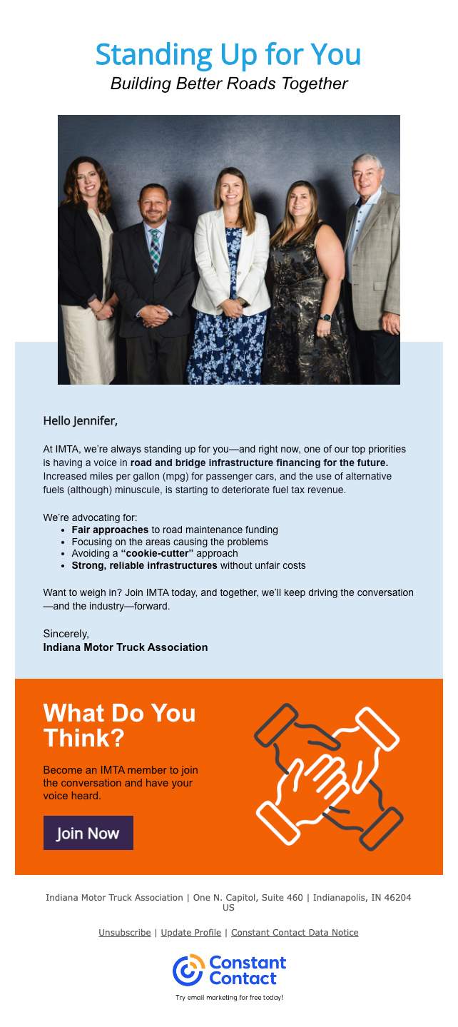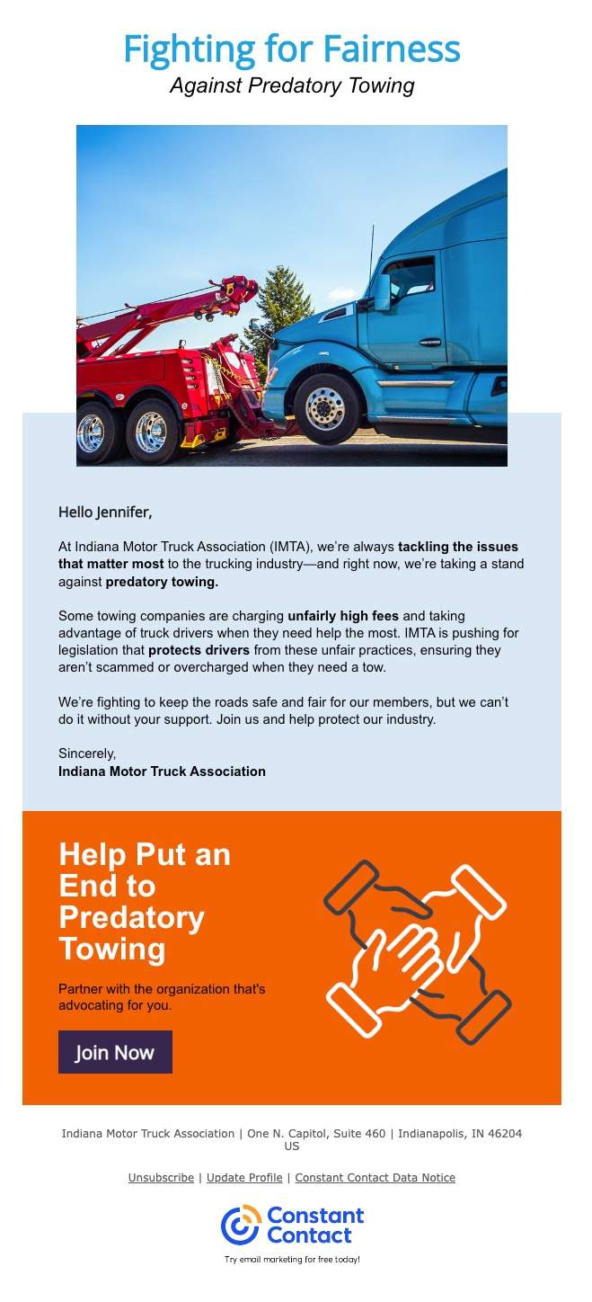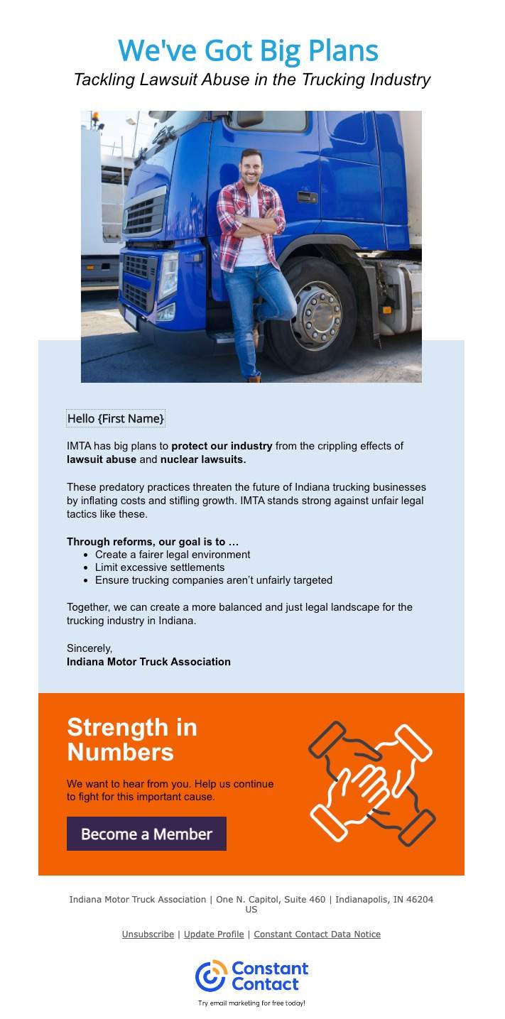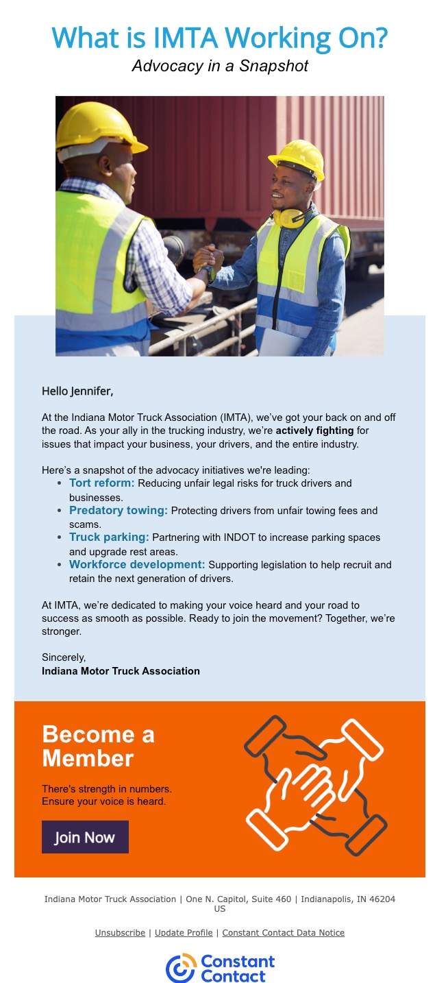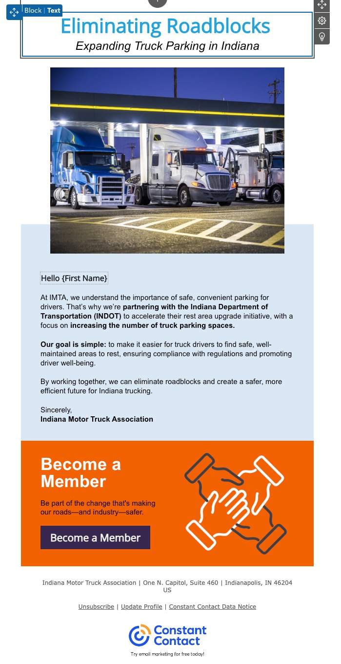I created an email campaign that focused on what the IMTA did offer: strong advocacy and meaningful networking. By shifting the messaging to highlight their role as the voice of Indiana trucking and a place to connect with others in the field, we reframed the offer. The tone stayed professional and respectful, but it was also human and approachable. No truck stop slang, just real talk about real value.